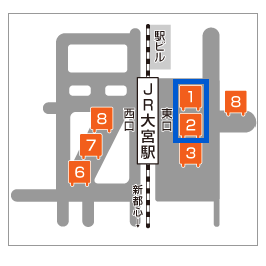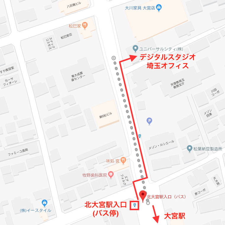 バス停前の横断歩道を渡り、大宮駅と反対方向にお進みください。